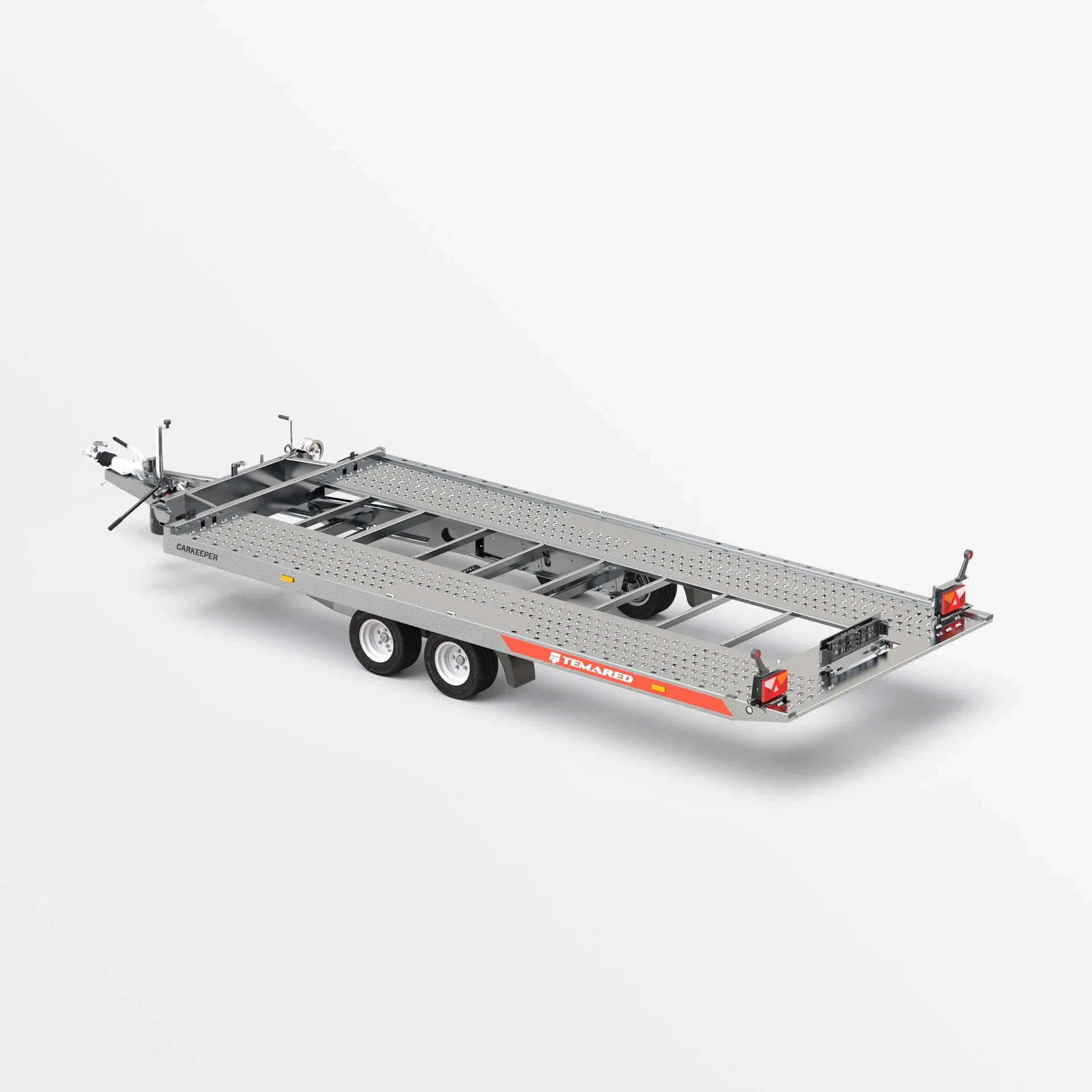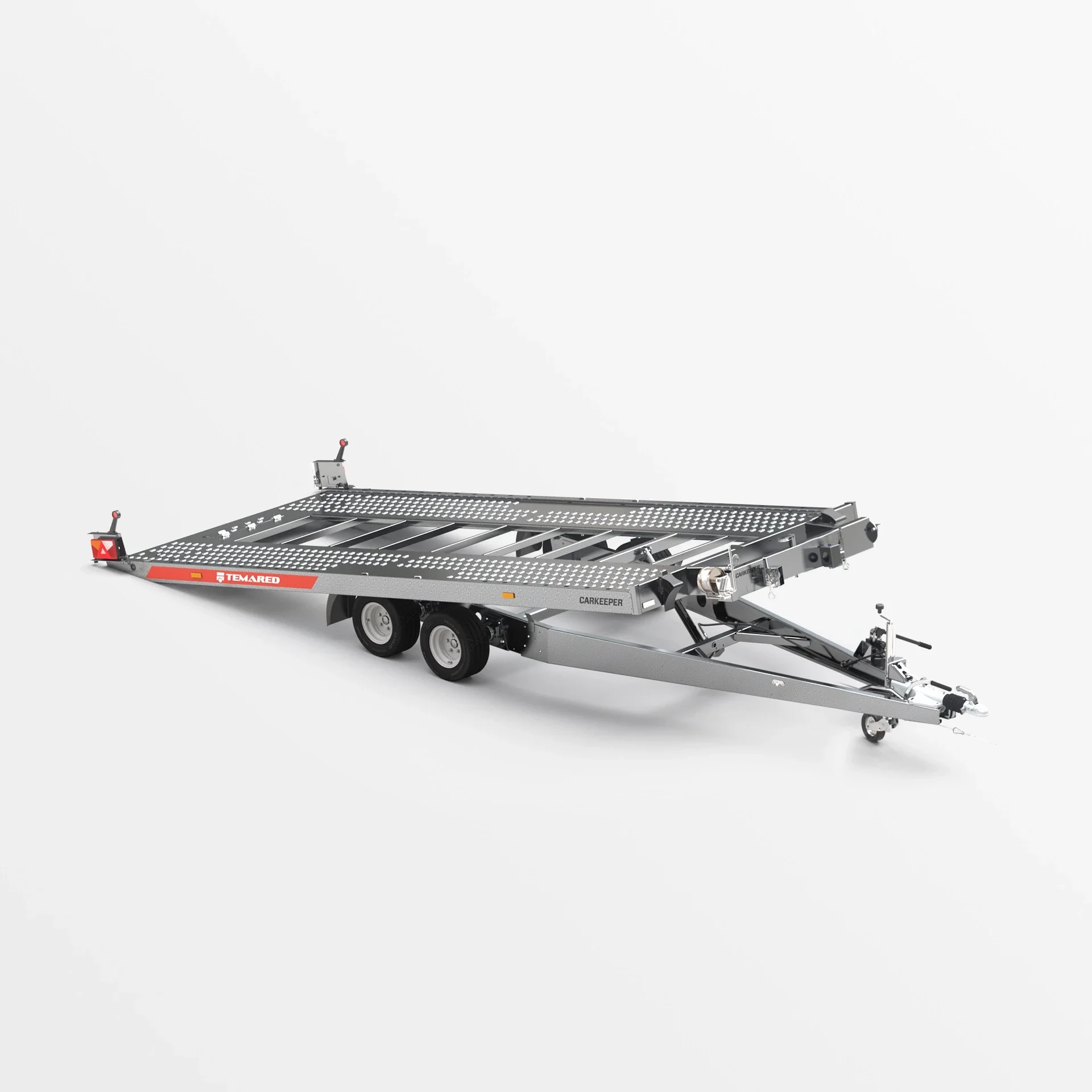 Een aanhanger met de functie om het transportoppervlak te kantelen. De gebruikte hydraulische cilinder garandeert een soepele en eenvoudige werking tijdens het laden. De lage overloophoek van 11° biedt het gemakkelijk laden van voertuigen met een lage bodemvrijheid. Het gesloten profielframe dat is ontworpen voor zware lasten, samen met de versterkte V dissel, zorgen voor veiligheid en duurzaamheid van de constructie. De zijbalken met bindogen en Lohr-plaatvloer maken het gemakkelijk om de voertuigen die worden vervoerd vast te zetten.