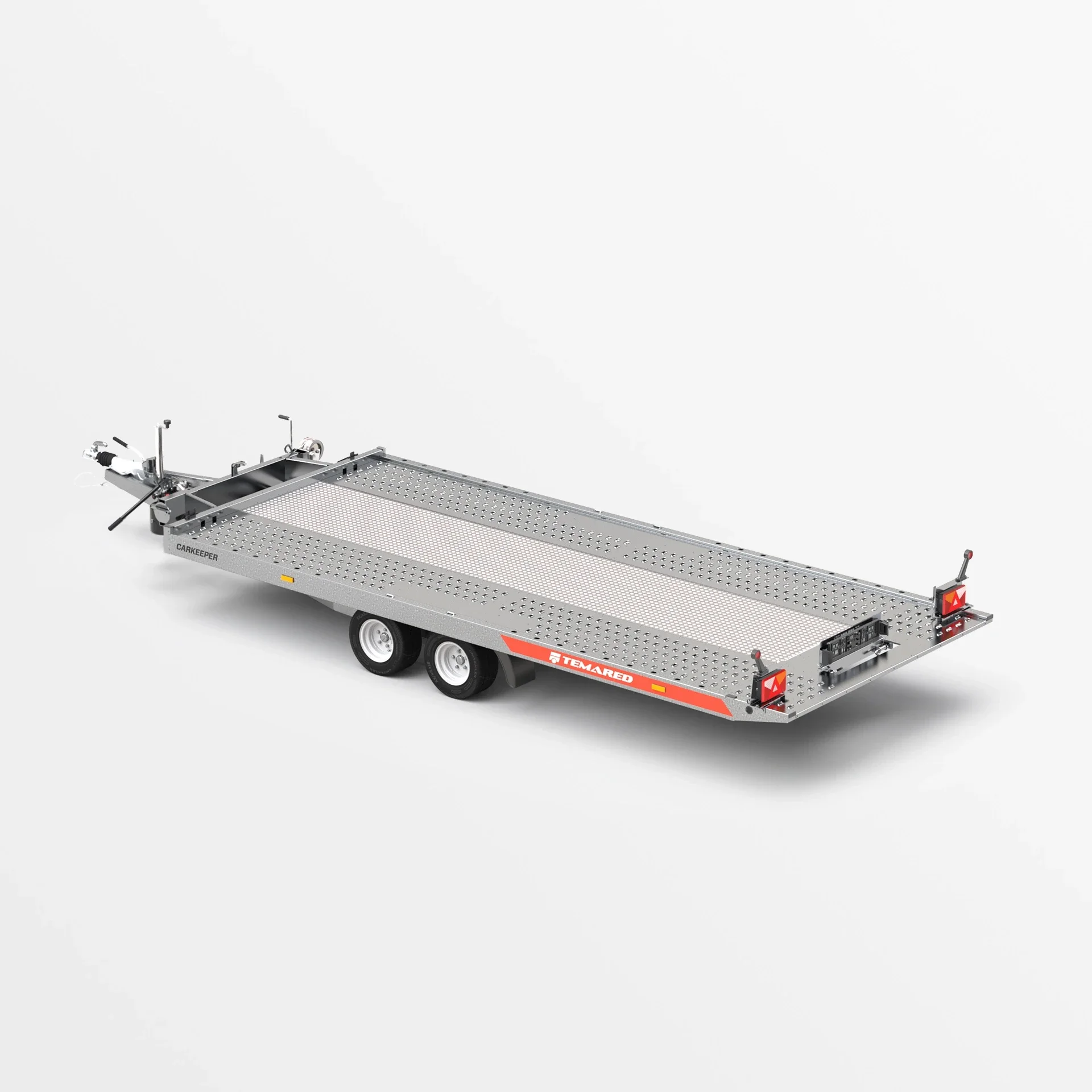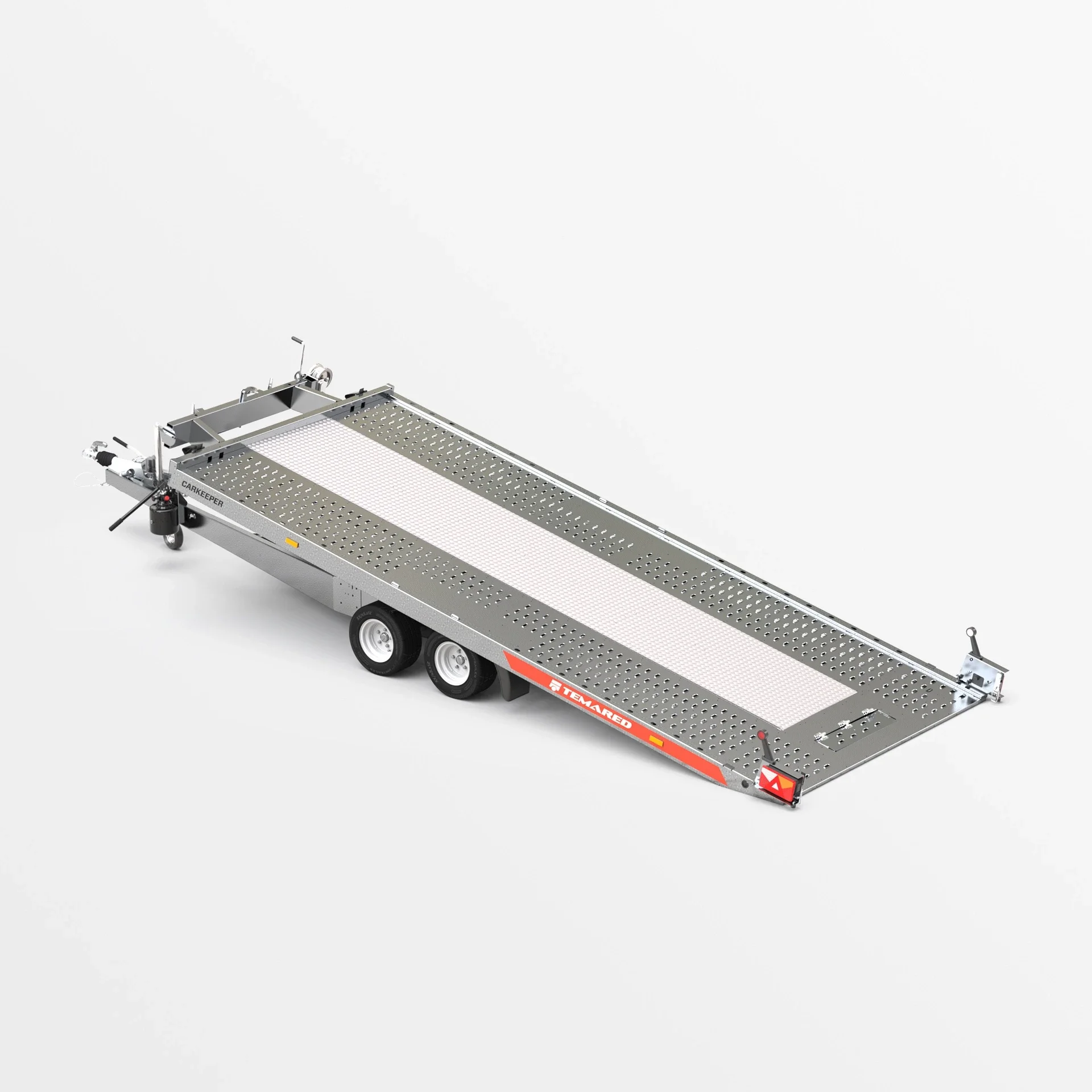 Een aanhanger met de functie om het transportoppervlak te kantelen. De gebruikte hydraulische cilinder garandeert een soepele en eenvoudige werking tijdens het laden. De lage overloophoek van 11° biedt het gemakkelijk laden van voertuigen met een lage bodemvrijheid. Het gesloten profielframe dat is ontworpen voor zware lasten, samen met de versterkte V dissel, zorgen voor veiligheid en duurzaamheid van de constructie. De zijbalken met bindogen en Lohr-plaatvloer maken het gemakkelijk om de voertuigen die worden vervoerd vast te zetten.