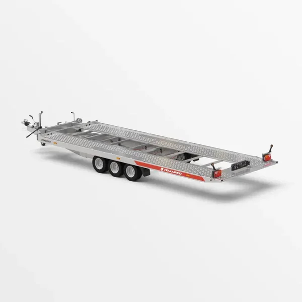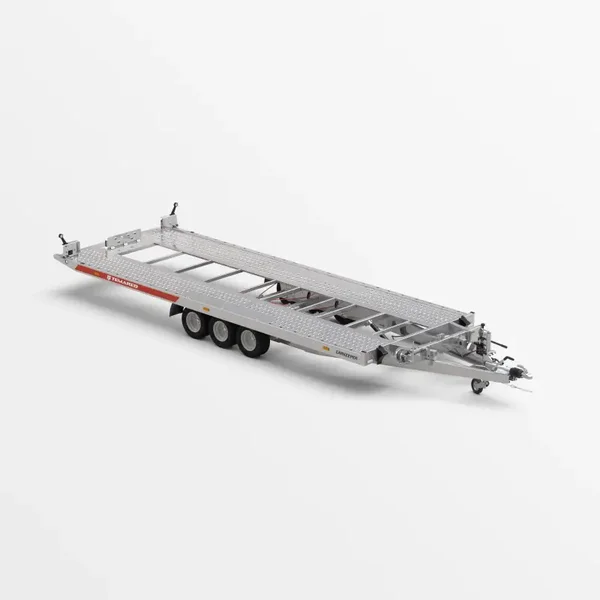 Een aanhanger met de functie om het transportoppervlak te kantelen. De gebruikte hydraulische cilinder garandeert een soepele en eenvoudige werking tijdens het laden. De lage overloophoek van 11° biedt het gemakkelijk laden van voertuigen met een lage bodemvrijheid. Het gesloten profielframe dat is ontworpen voor zware lasten, samen met de versterkte V dissel, zorgen voor veiligheid en duurzaamheid van de constructie. De zijbalken met bindogen en Lohr-plaatvloer maken het gemakkelijk om de voertuigen die worden vervoerd vast te zetten.